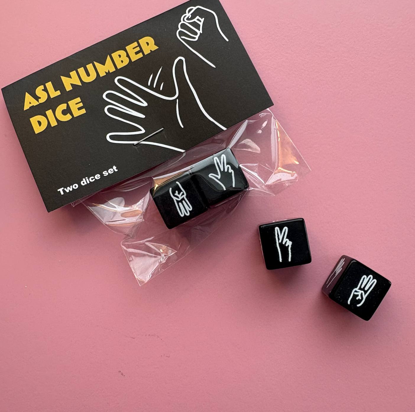 Bring learning to life with this unique pair of ASL number dice! Each 16 mm die features hand-drawn American Sign Language numbers 1–6, shown in a crisp white outline on a black background. Perfect for classrooms, games, math activities, or ASL practice.